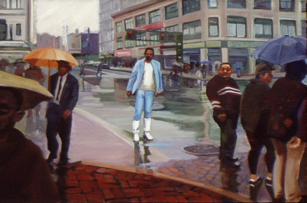 Blue Apollo began in Harlem during a month-long stay September 1998 at a (not “the”) Chelsea hotel, whence I could begin research for a series of New York paintings while also visiting museums at leisure. We’d just emerged from the Studio Museum, down the street from the Apollo Theatre, when the blue man in white moon boots stepped in front of my camera. Other figures in the painting, the man with the yellow umbrella, the guy with the horizontal stripes on his chest, the two women in the right corner, were found nearby. Unfortunately, no finally satisfactory photographed material showed up for the left corner but I “completed” the painting anyway, and since our grandson Jesse liked it, the work accompanied him as he moved about Seattle, hanging it on various walls as his career and family life changed and grew.